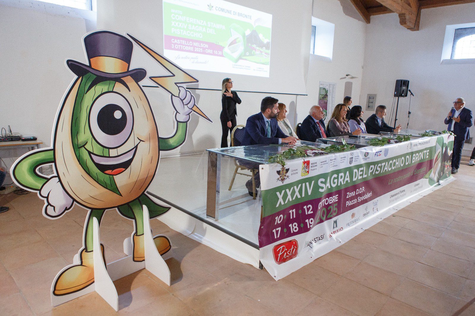 Con il suo occhio ciclopico e il cappello inglese, Mr Bront diventa così ambasciatore dell’identità di Bronte, una città che sa unire mito, storia e tradizione, e che nel suo pistacchio – l’“oro verde” – ha il simbolo più autentico di prosperità. La mascotte sarà utilizzata per identificare spazi e servizi dedicati alle famiglie e alle necessità speciali, come il punto “nurse” per l’allattamento e il riposo delle mamme, l’area per il cambio dei bambini e il parcheggio riservato ai diversamente abili. Inoltre, Mr Bront accompagnerà tutti gli eventi. «Ormai è noto come sia vano tentare di frenare il desiderio di pistacchio – afferma il sindaco Pino Firrarello – per assecondare il palato c’è un’unica soluzione: venire alla Sagra. Chi lo farà troverà una cittadina accogliente con 1.000 attrazioni. Fra queste “Mr Bront”, che sintetizza l’essenza di questa bella cittadina». Fonte “La Sicilia del 08-10-2025